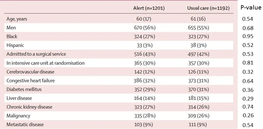 This was a randomized trial I ran looking at electronic alerting for acute kidney injury. And you'll have to take my word that it is not fraudulent. I mean, if I had wanted to fake the data I probably would have made the study positive – but that's neither here nor there. Basically, if you look across the two arms, you can see that the numbers look pretty similar for all of these baseline variables. 56% were men in the alert arm, compared to 55% in the usual care arm. Nothing too suspicious, right?