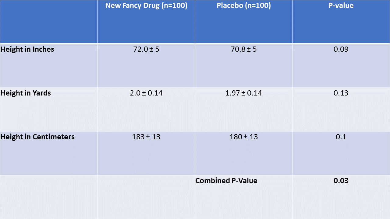 All three variables have p-values in the reasonable range. In fact, they only differ at all due to rounding. But the combined p-value is lower than any of the individual ones. This would be fair if height in inches and height in yards and height in centimeters weren't correlated – we'd want to identify a trial that had a lot of balance problems across many variables. But that isn't the case here. The three variables are perfectly correlated, and combining them gives extra weight to the same benign phenomenon.